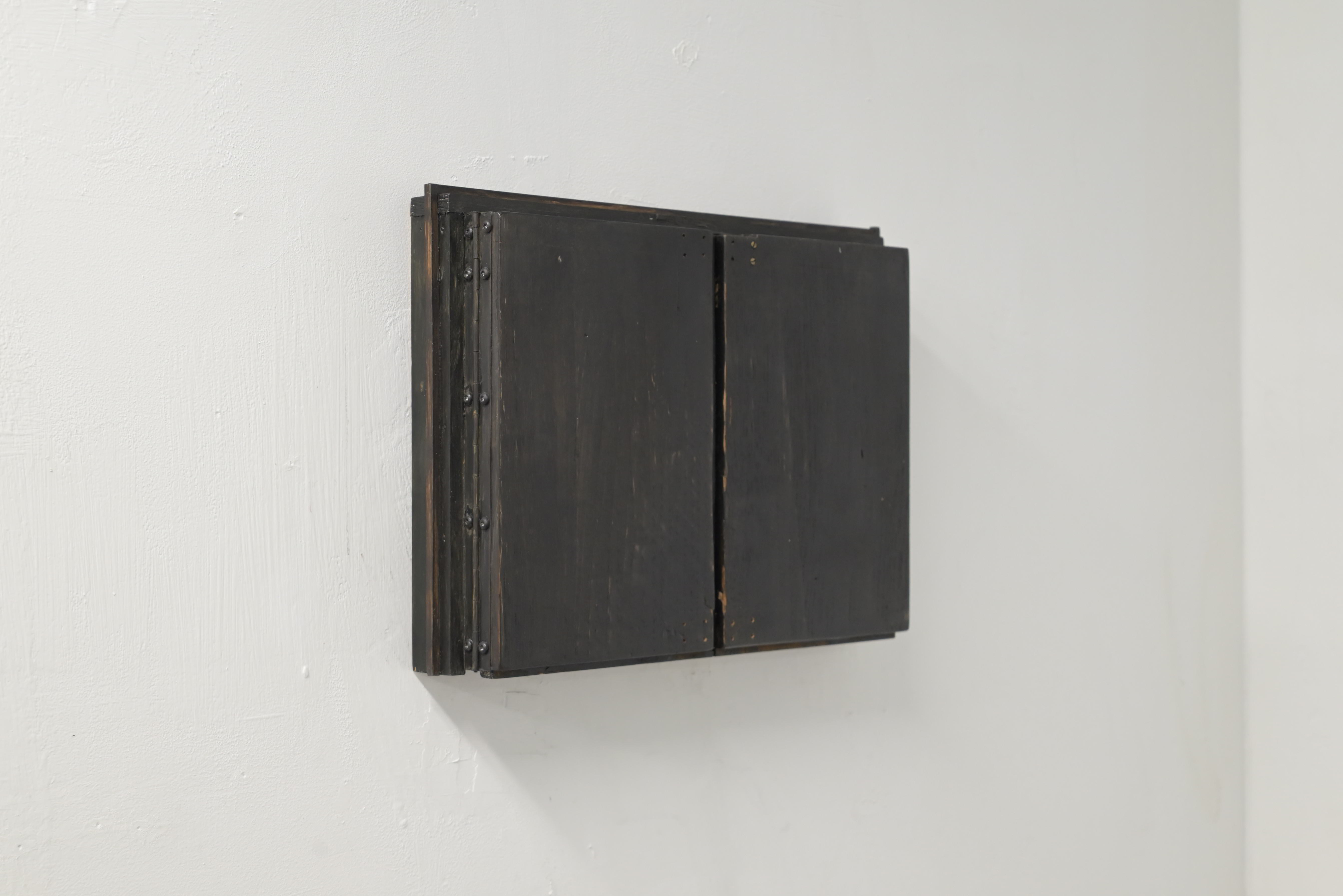 The exhibition space was divided into two separate rooms by a temporary wall. The new two rooms could only be entered by two different entries from the outside. Inside the exhibition space was no connection between the two rooms. One room was bright, wide, open and empty at first sight. If one entered this room there was a strong smell of chlorine, coming from a 15m wall painting that Dominik Cosentino realised on one side of the build-in wall. By turning back to the entry, behind a corner hanging on the wall, one could discover a small sculpture by Philipp Boshart. The cabinet-like object appeared to be closed and could not be opened. The second room was dark, narrow and directed to one end facing the entry. At the end of this corridor one could find another cabinet-like sculpture. In contrary to the first one its doors were open and like a window it revealed a painted landscape on its inside.