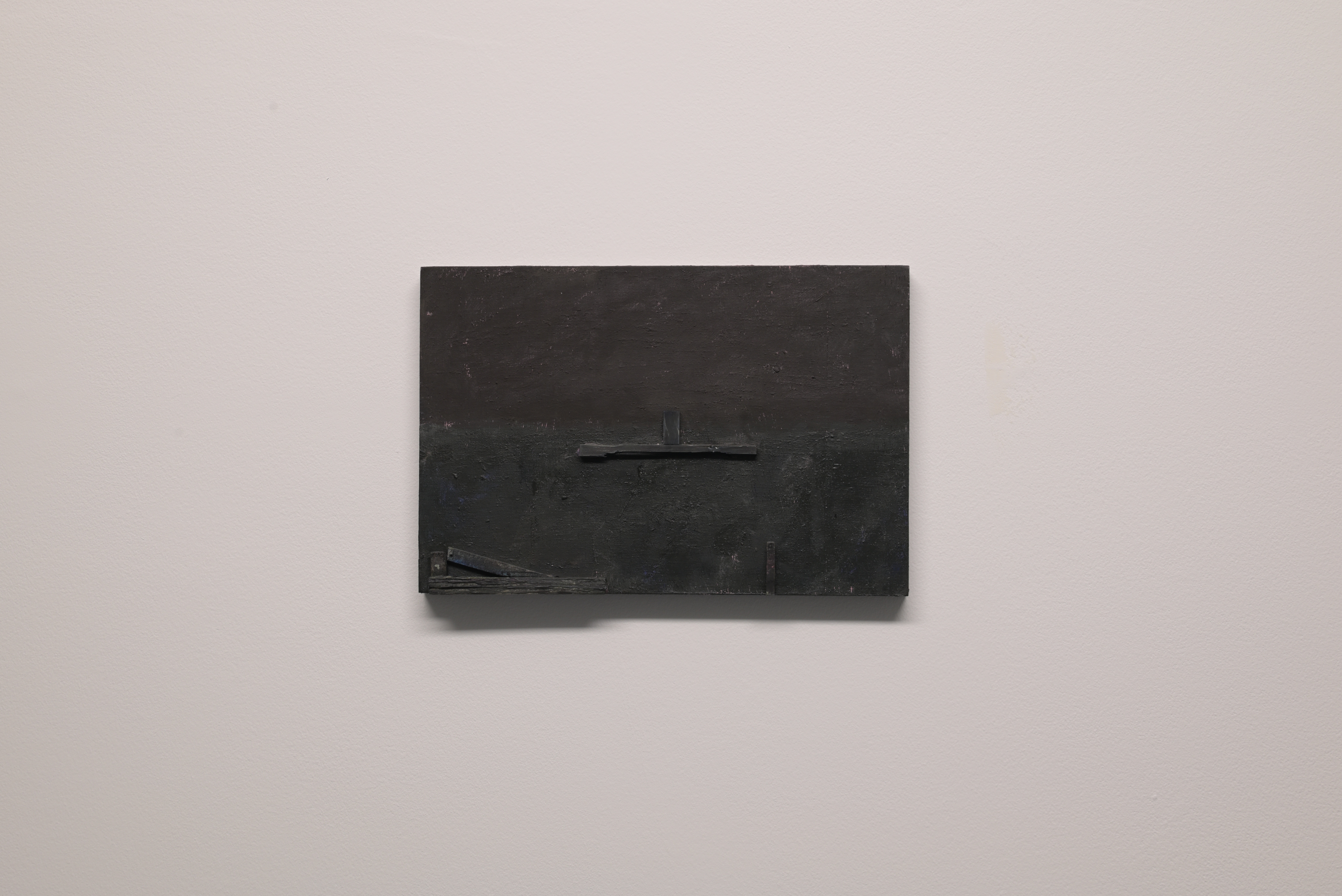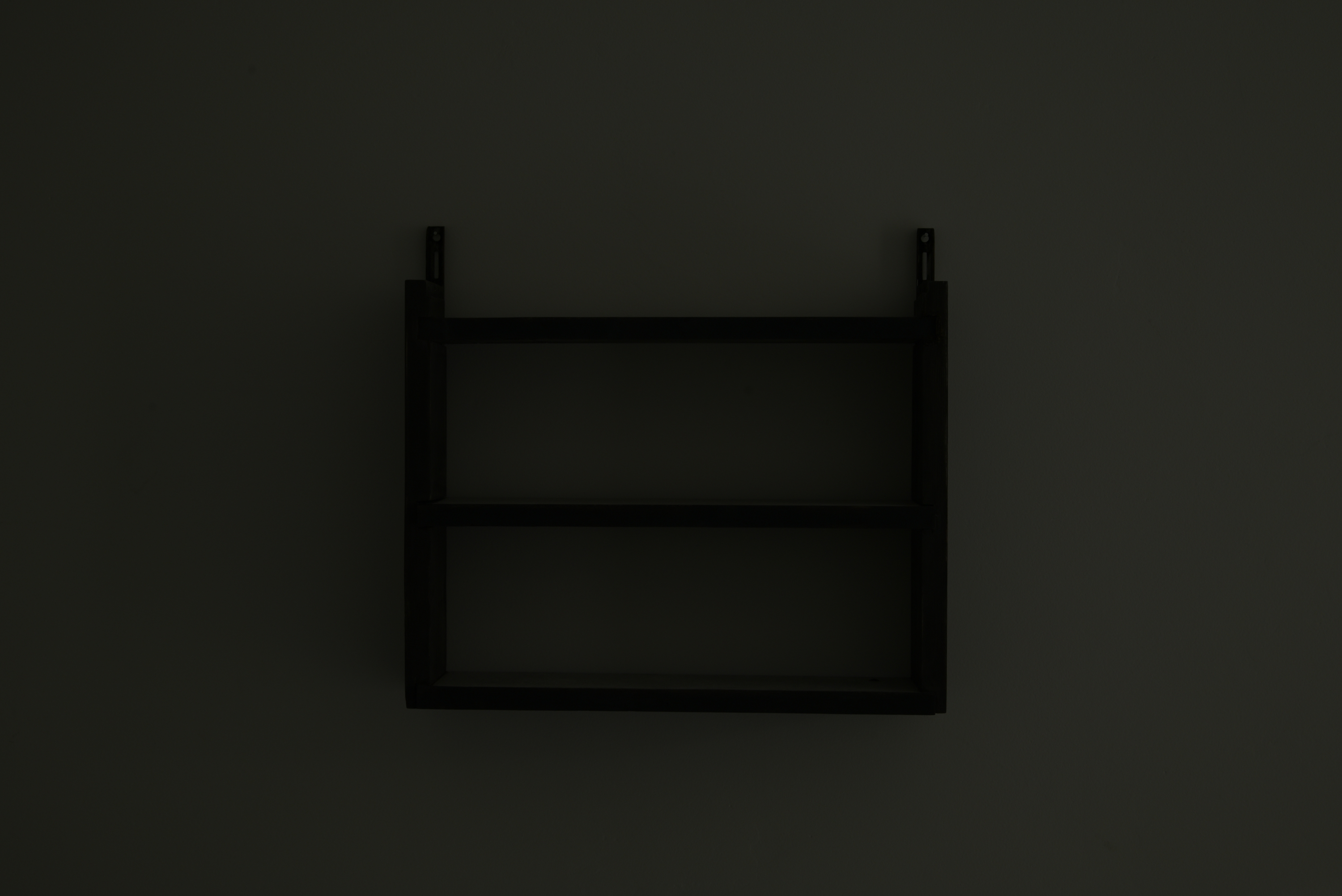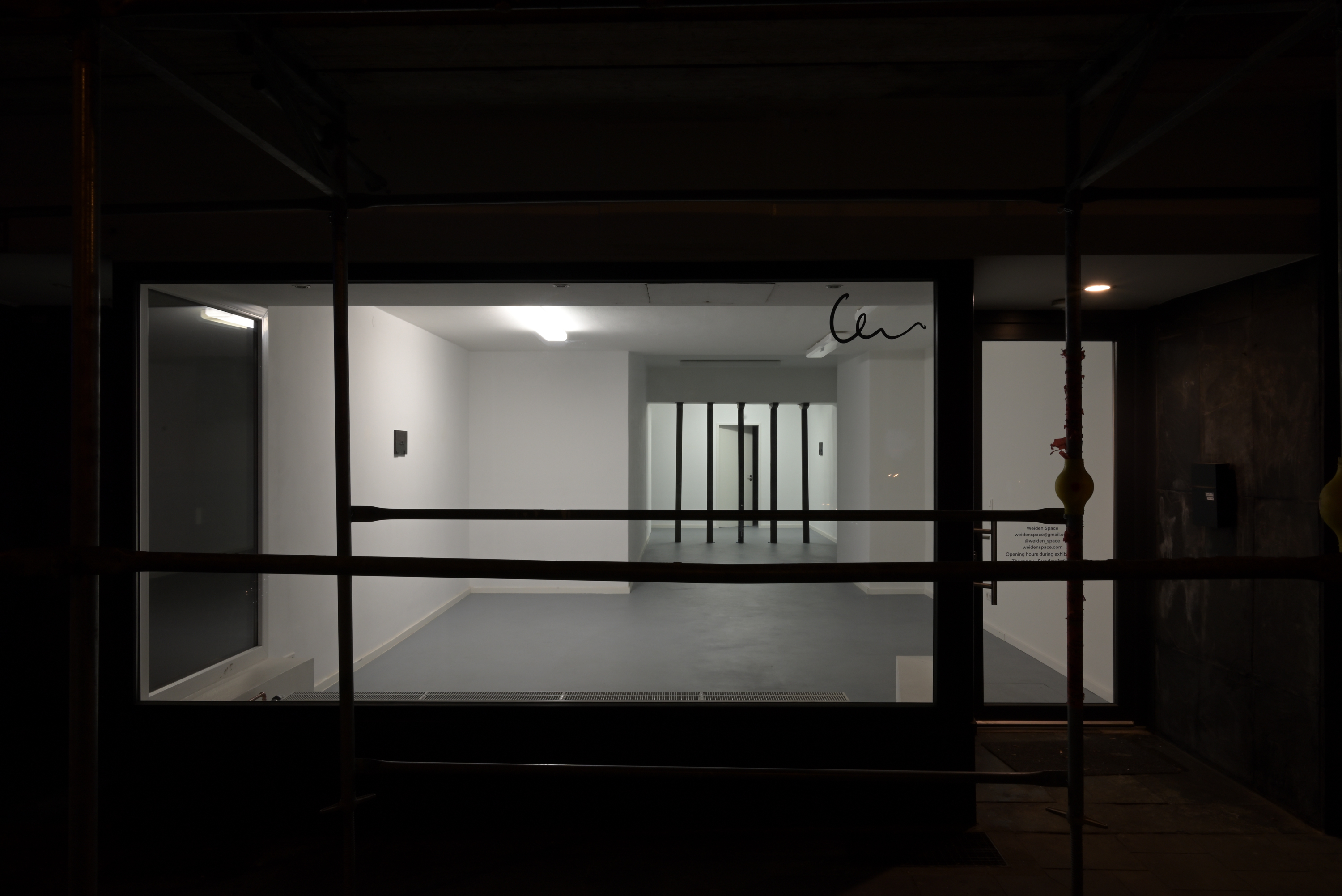 Lachreiz vor Säulen is a site-specific series of sculptures made for Weiden Space in 2023. The work consists of five wooden pillars wich are positioned underneath an existing beam inside the space. They are made of oak wood wich has been chemically treated to emulate the appearance of bog oak. Each pillar bears cracks, scratches and various mortises as if they had been reused over time for different purposes. Within the room, the line of pillars creates a barrier that divides the space. It can be crossed, but only by squeezing through the narrow gaps between two of the pillars. Both in the space in front of the pillars and the space behind them one can find a small work hanging on the wall. The back room of the space is only accessible by again squeezing through a half-closed door. Inside there is no lighting, so one can only vaguely make out a shelf-like wall piece and five roughly folded protective sheets scattered about.